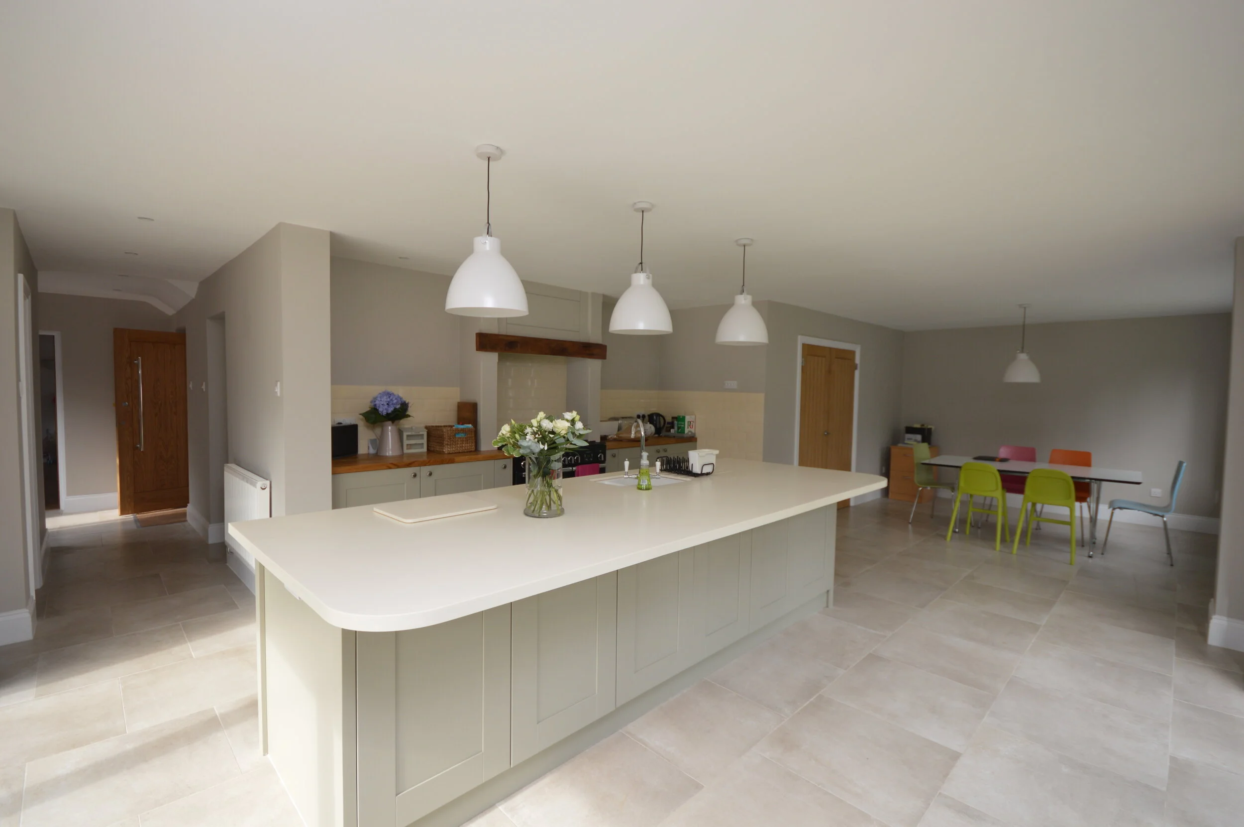 Removal of load bearing walls and formation of a side extension to create a large bright open plan island kitchen dining area